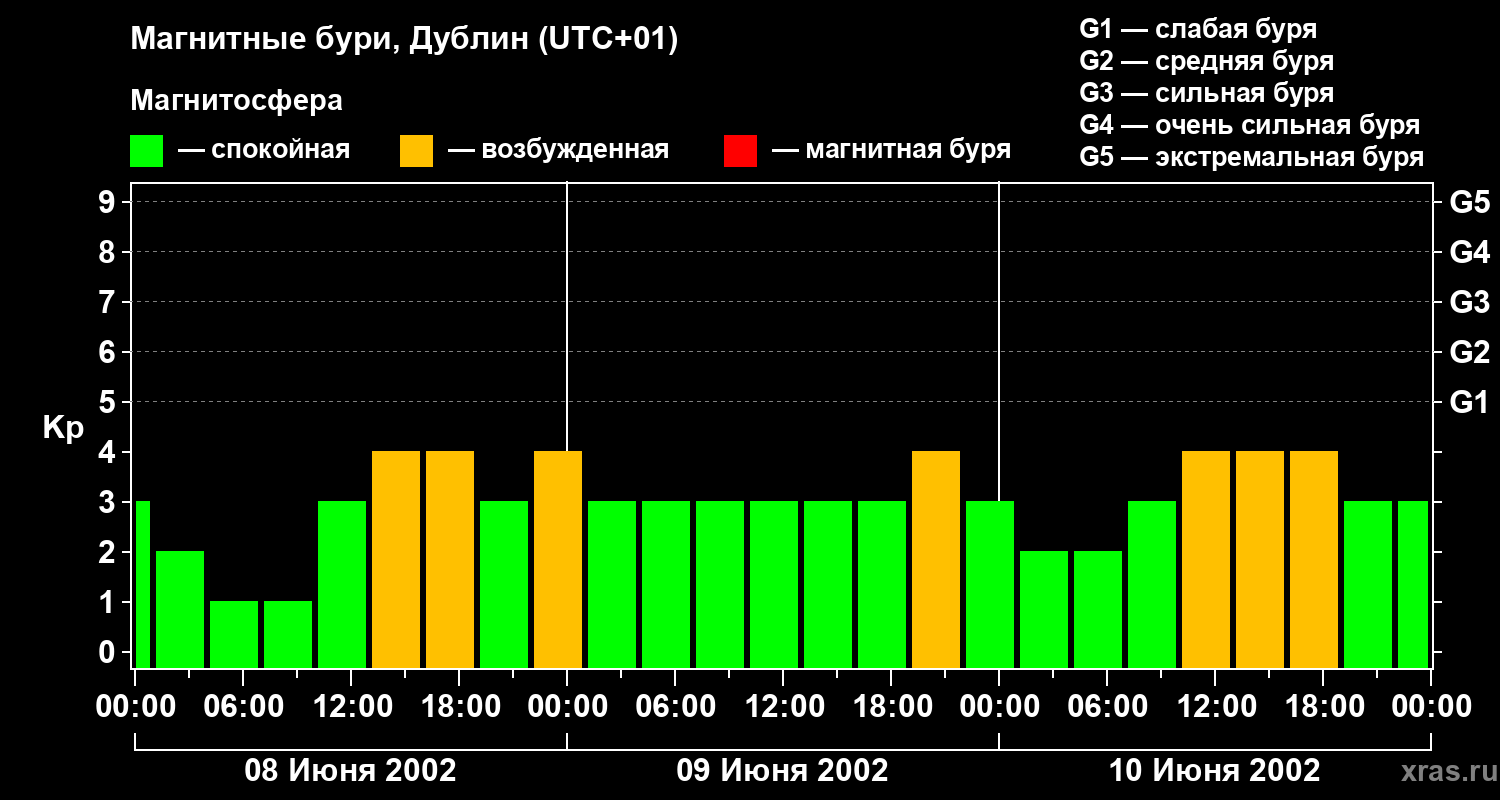 Изменения геомагнитного индекса Kp с 8 по 10 июня 2002 года для средних широт