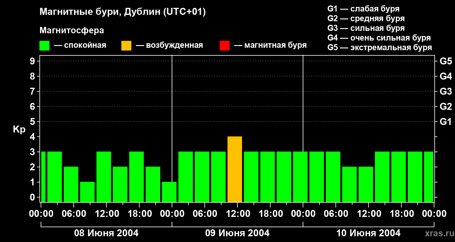 Изменения геомагнитного индекса Kp с 8 по 10 июня 2004 года для средних широт