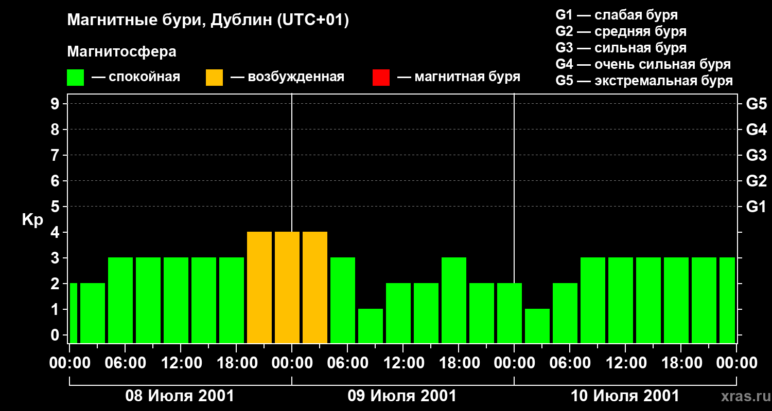 Изменения геомагнитного индекса Kp с 8 по 10 июля 2001 года для средних широт