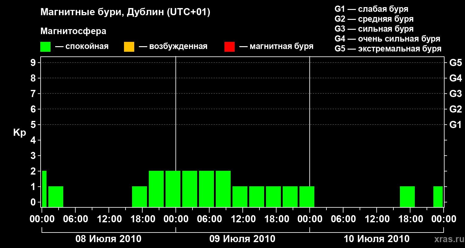 Изменения геомагнитного индекса Kp с 8 по 10 июля 2010 года для средних широт