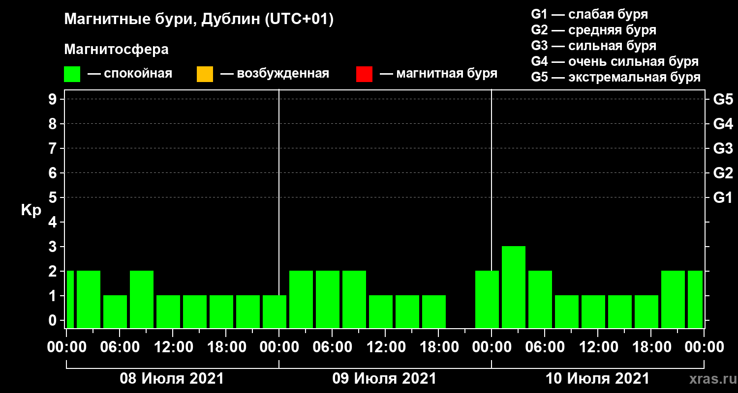 Изменения геомагнитного индекса Kp с 8 по 10 июля 2021 года для средних широт