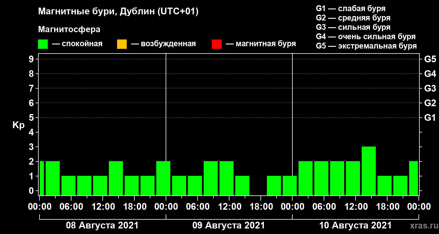 Изменения геомагнитного индекса Kp с 8 по 10 августа 2021 года для средних широт