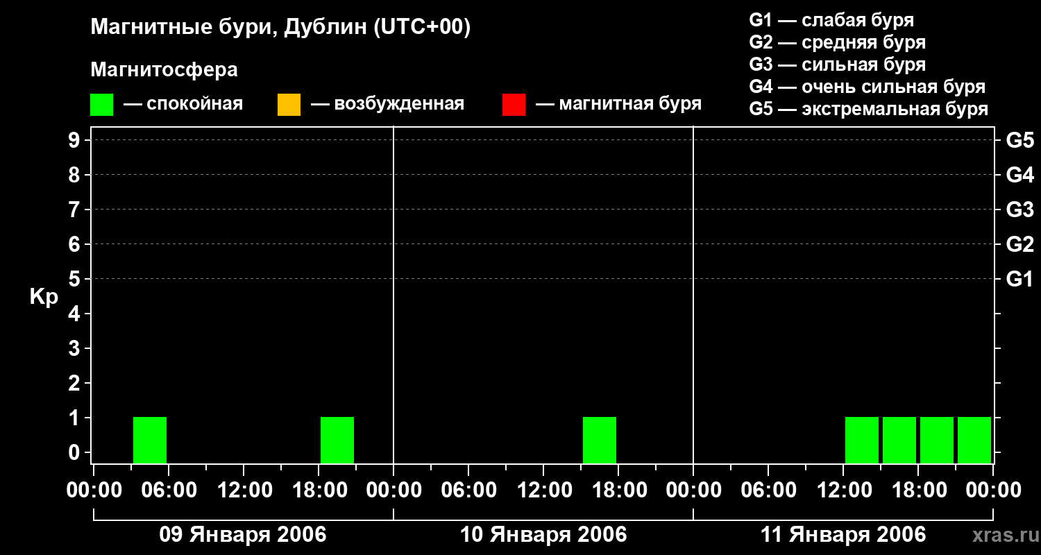 Изменения геомагнитного индекса Kp с 9 по 11 января 2006 года для средних широт