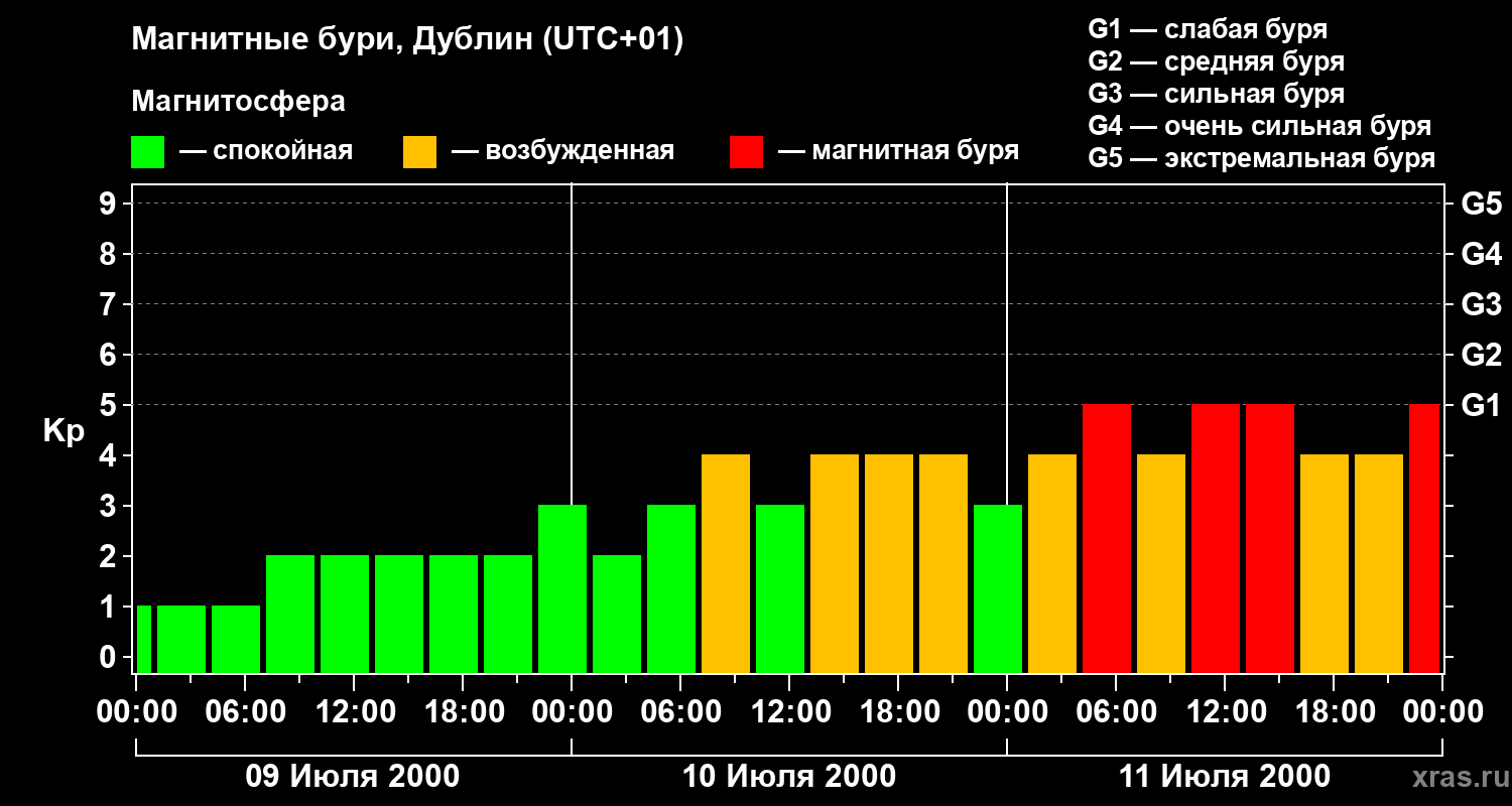 Изменения геомагнитного индекса Kp с 9 по 11 июля 2000 года для средних широт