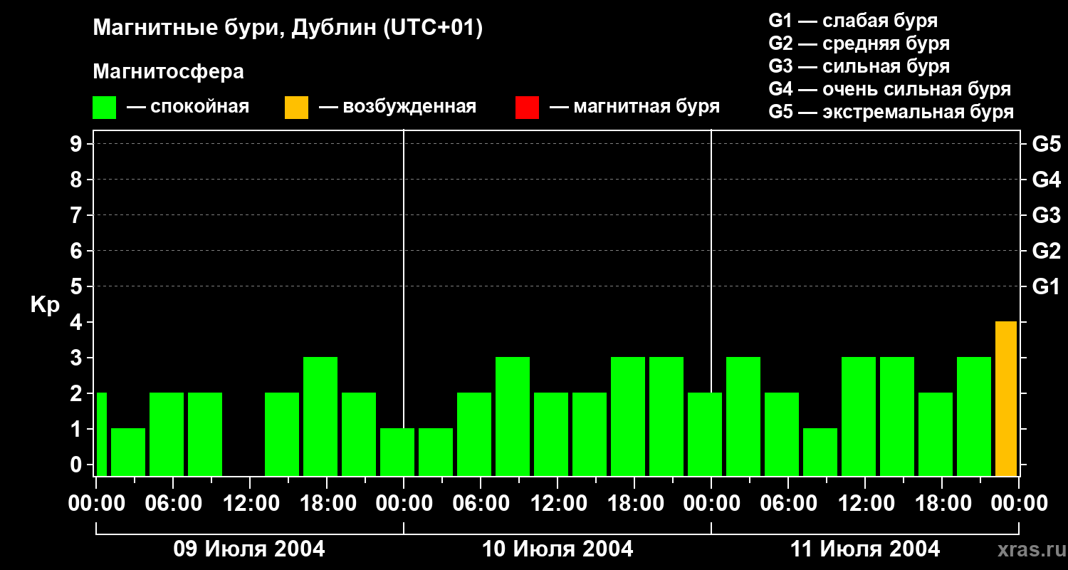 Изменения геомагнитного индекса Kp с 9 по 11 июля 2004 года для средних широт