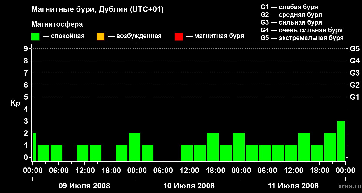 Изменения геомагнитного индекса Kp с 9 по 11 июля 2008 года для средних широт