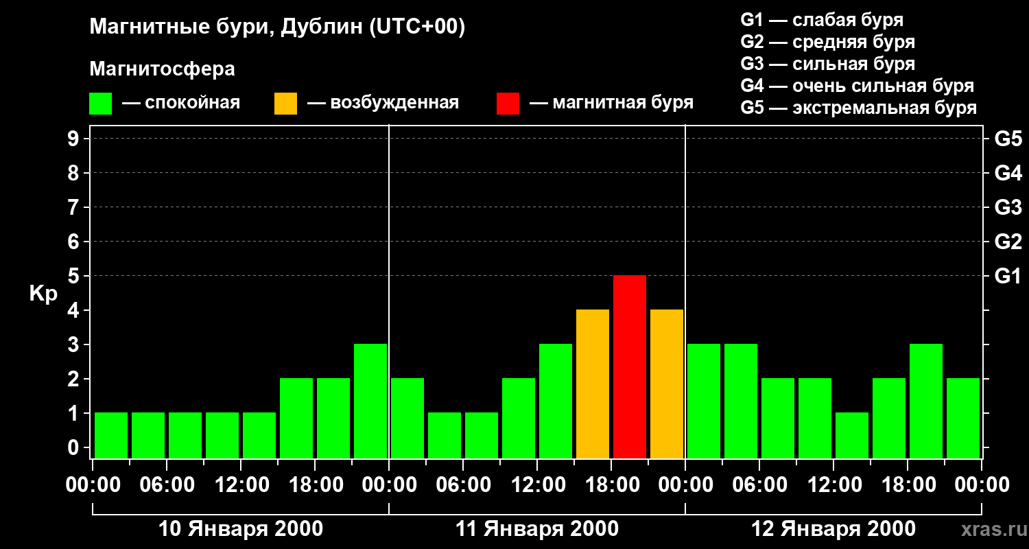Изменения геомагнитного индекса Kp с 10 по 12 января 2000 года для средних широт