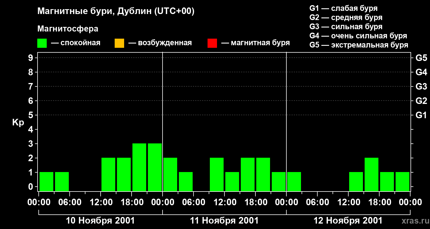 Изменения геомагнитного индекса Kp с 10 по 12 ноября 2001 года для средних широт
