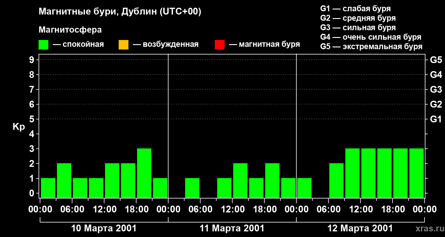 Изменения геомагнитного индекса Kp с 10 по 12 марта 2001 года для средних широт
