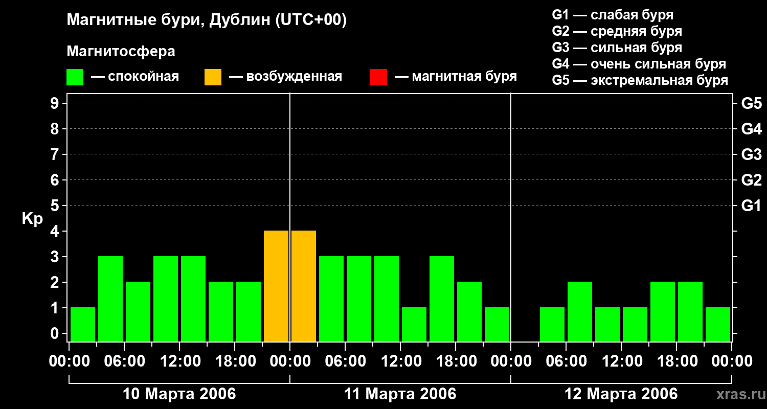 Изменения геомагнитного индекса Kp с 10 по 12 марта 2006 года для средних широт