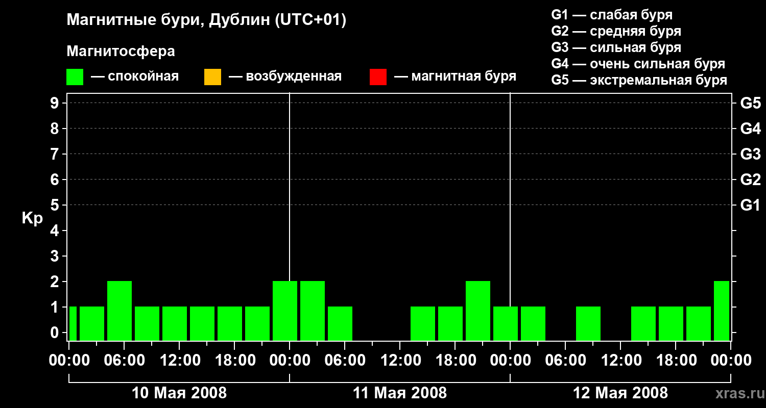 Изменения геомагнитного индекса Kp с 10 по 12 мая 2008 года для средних широт