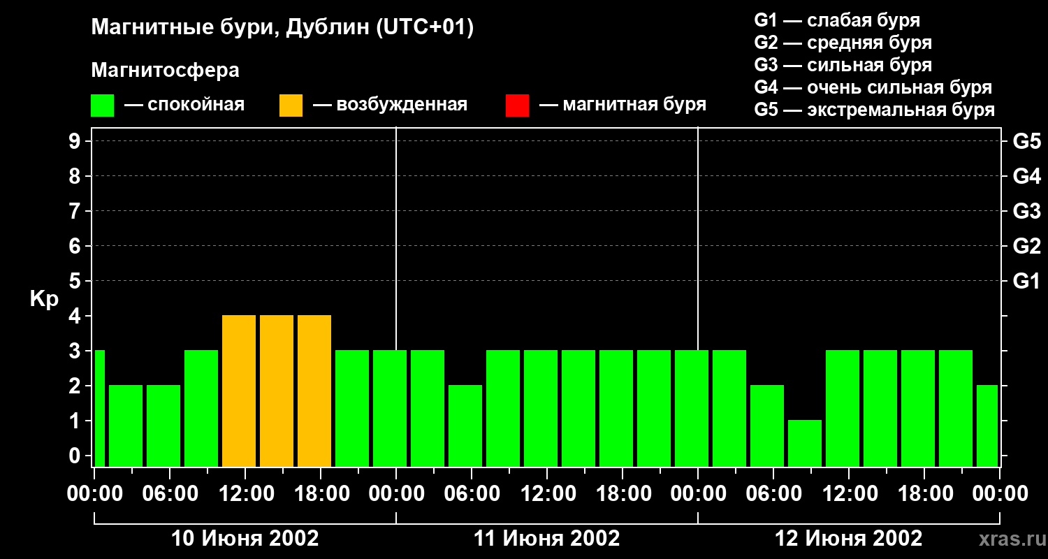 Изменения геомагнитного индекса Kp с 10 по 12 июня 2002 года для средних широт