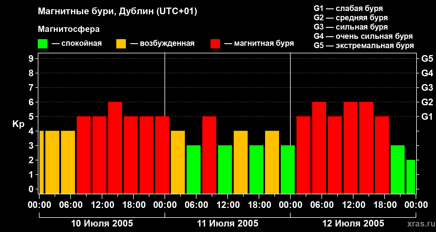 Изменения геомагнитного индекса Kp с 10 по 12 июля 2005 года для средних широт