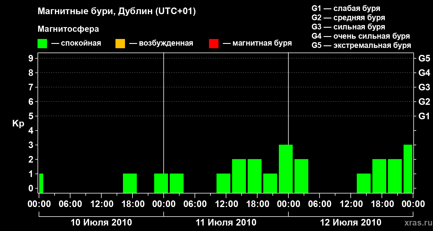 Изменения геомагнитного индекса Kp с 10 по 12 июля 2010 года для средних широт
