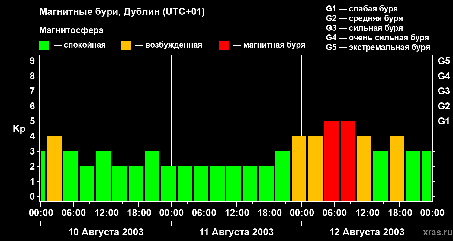 Изменения геомагнитного индекса Kp с 10 по 12 августа 2003 года для средних широт