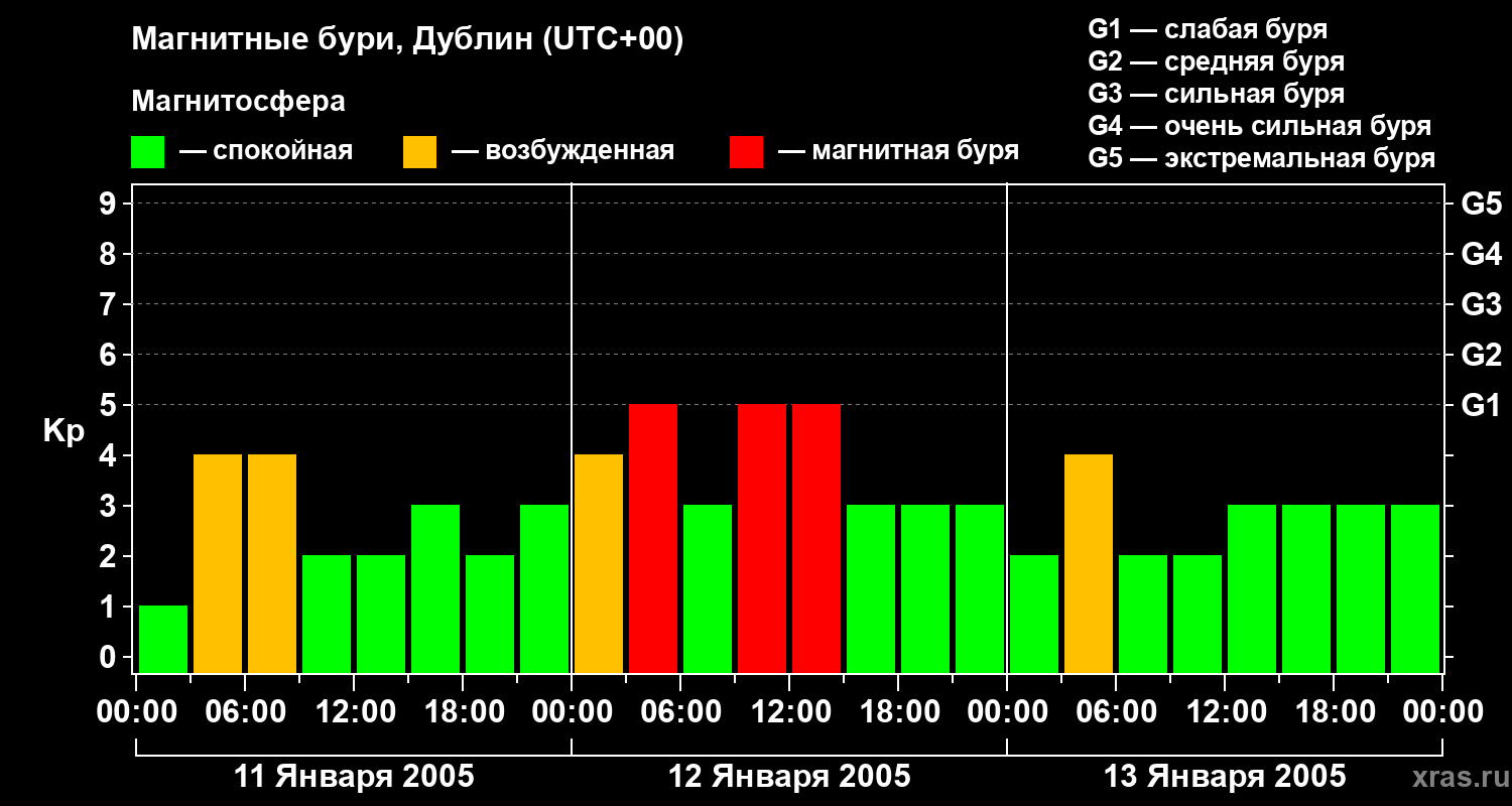 Изменения геомагнитного индекса Kp с 11 по 13 января 2005 года для средних широт
