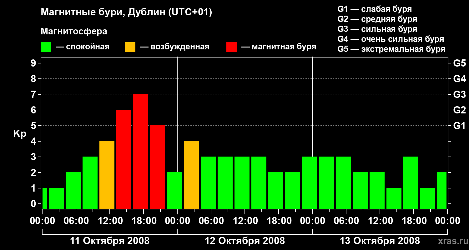 Изменения геомагнитного индекса Kp с 11 по 13 октября 2008 года для средних широт