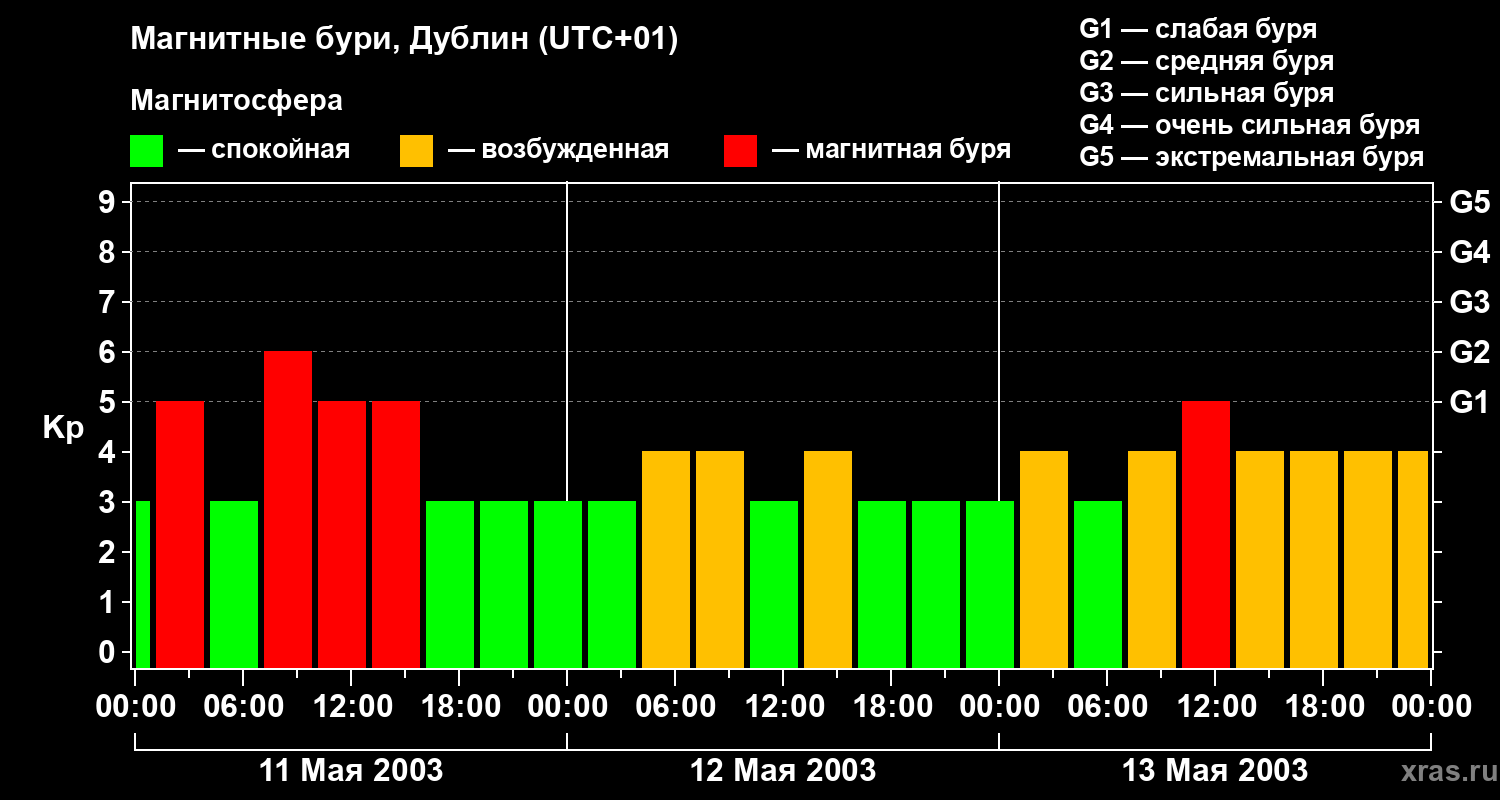 Изменения геомагнитного индекса Kp с 11 по 13 мая 2003 года для средних широт