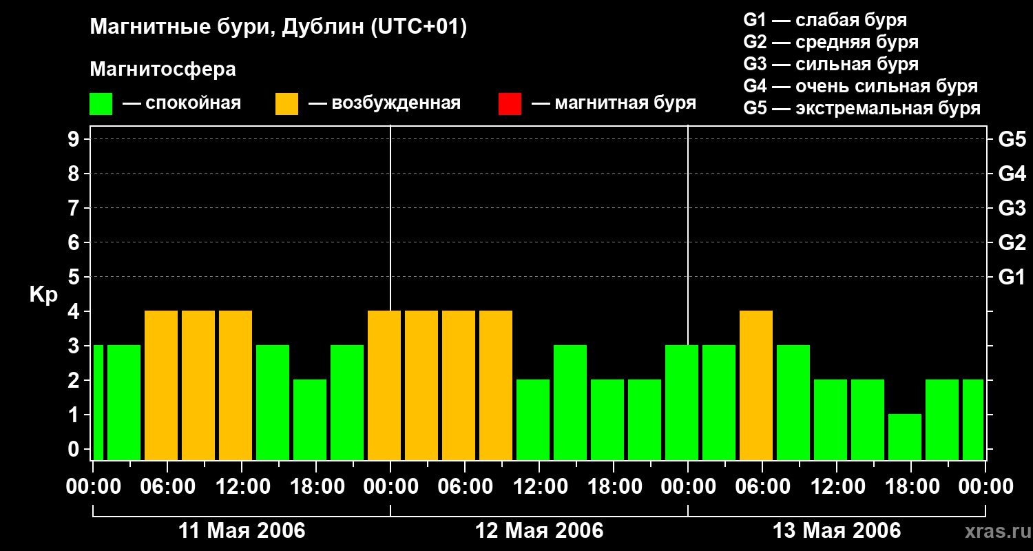 Изменения геомагнитного индекса Kp с 11 по 13 мая 2006 года для средних широт