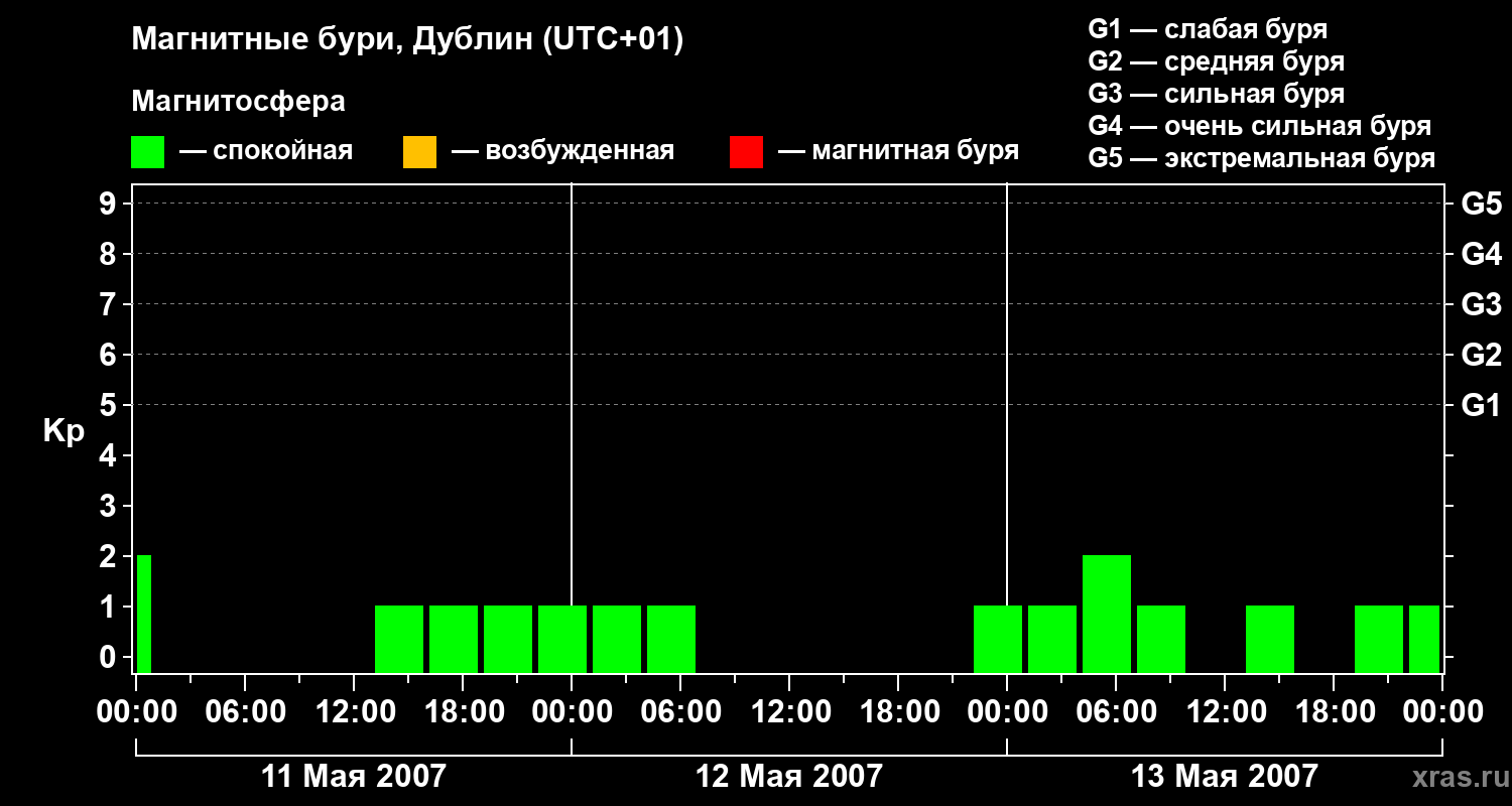 Изменения геомагнитного индекса Kp с 11 по 13 мая 2007 года для средних широт