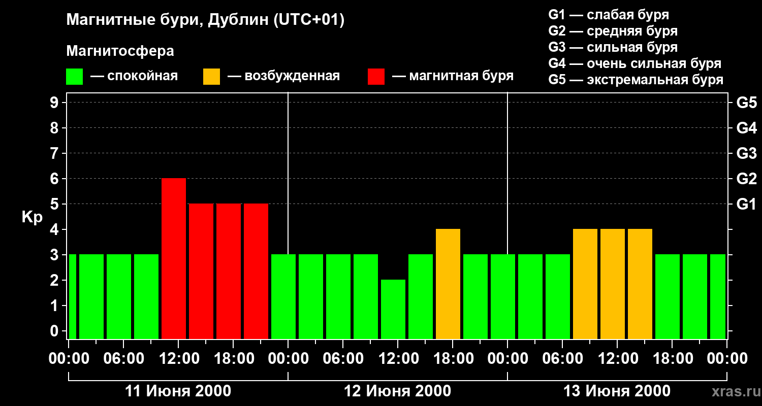 Изменения геомагнитного индекса Kp с 11 по 13 июня 2000 года для средних широт