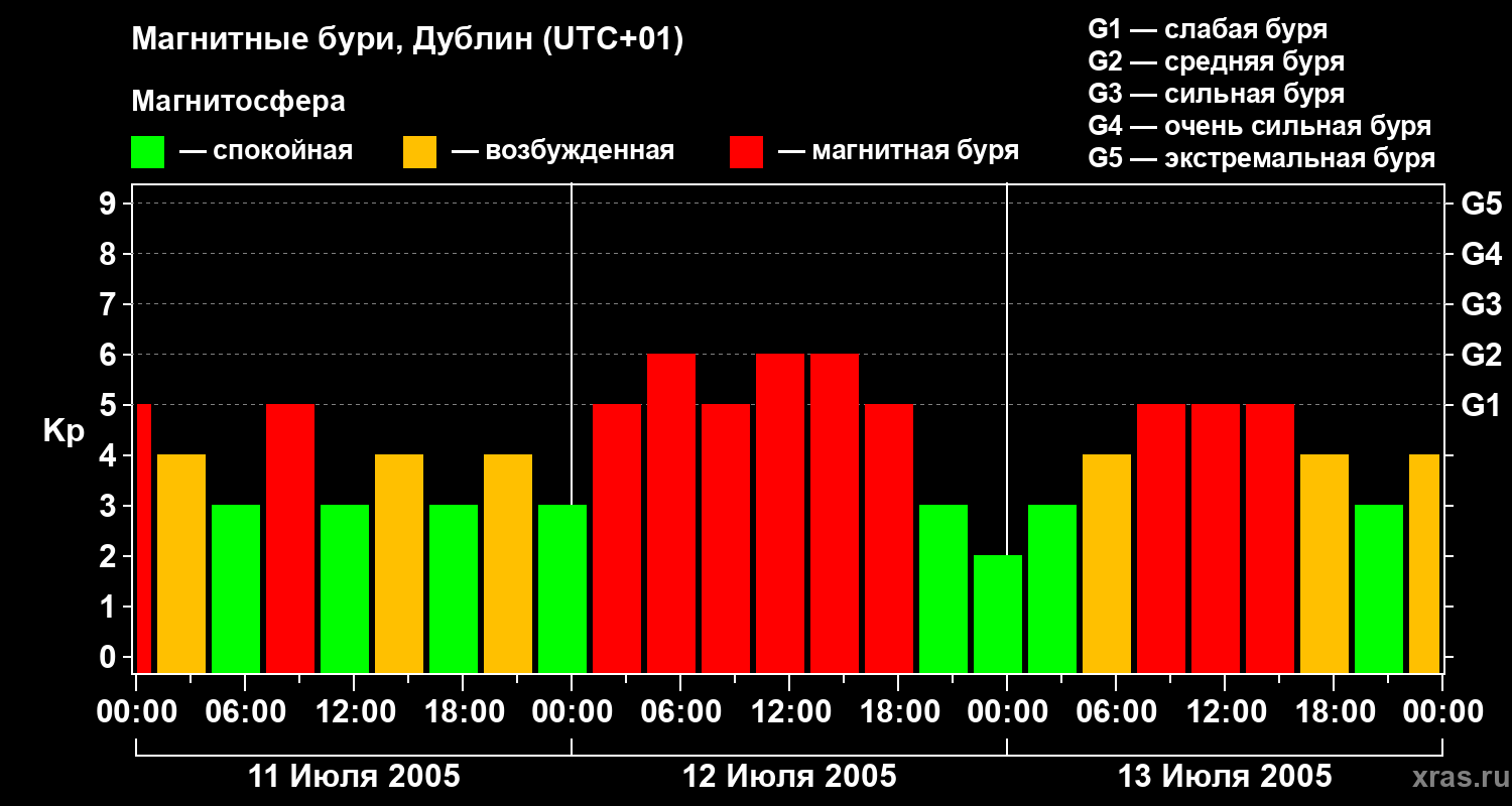 Изменения геомагнитного индекса Kp с 11 по 13 июля 2005 года для средних широт