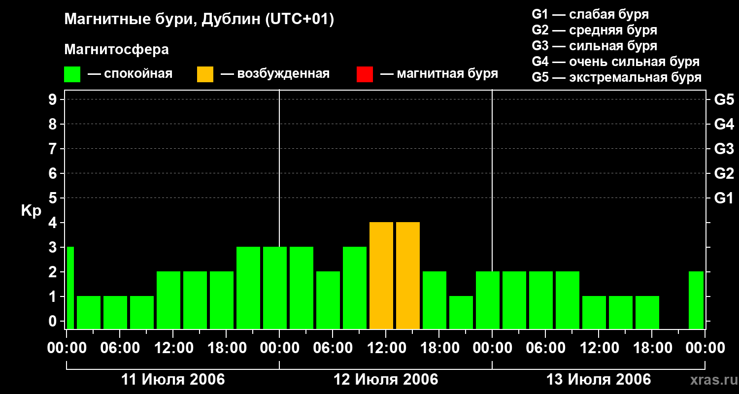 Изменения геомагнитного индекса Kp с 11 по 13 июля 2006 года для средних широт