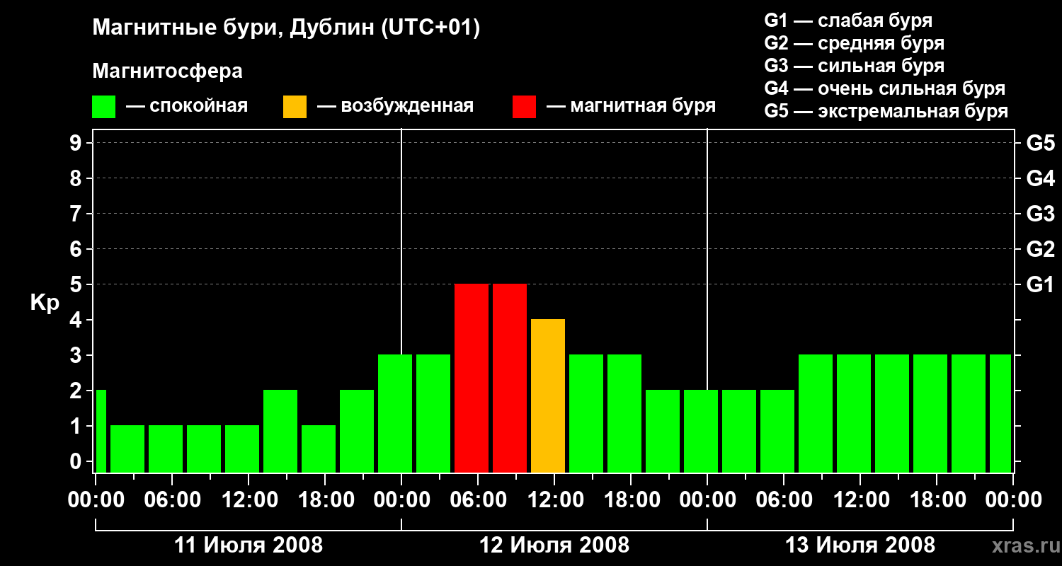 Изменения геомагнитного индекса Kp с 11 по 13 июля 2008 года для средних широт