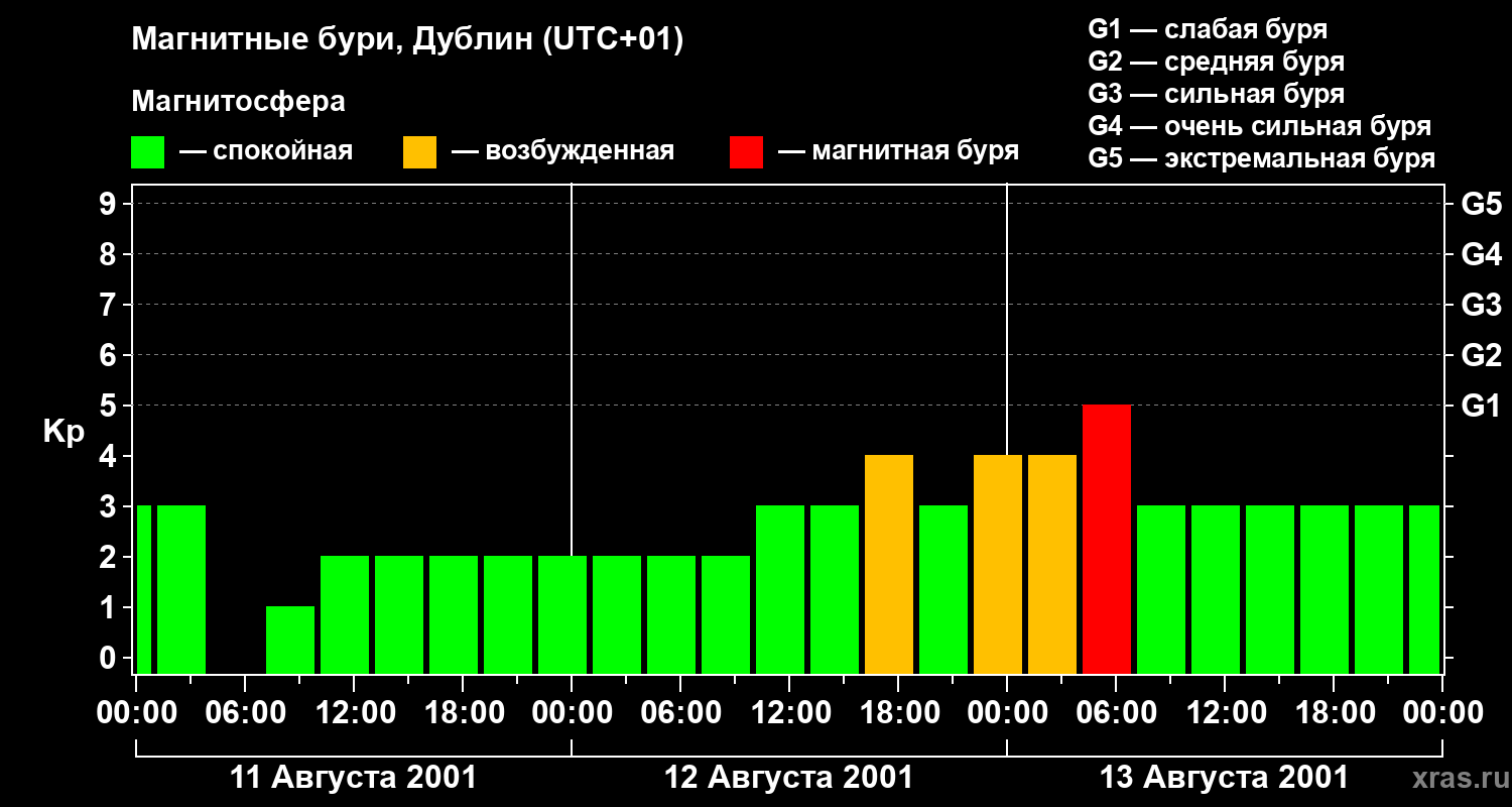 Изменения геомагнитного индекса Kp с 11 по 13 августа 2001 года для средних широт