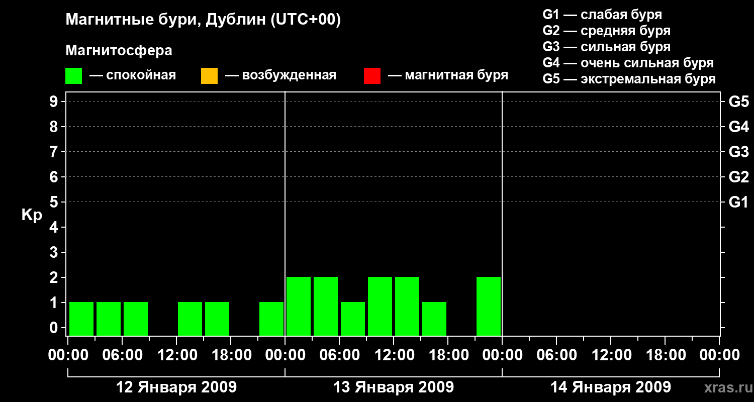 Изменения геомагнитного индекса Kp с 12 по 14 января 2009 года для средних широт