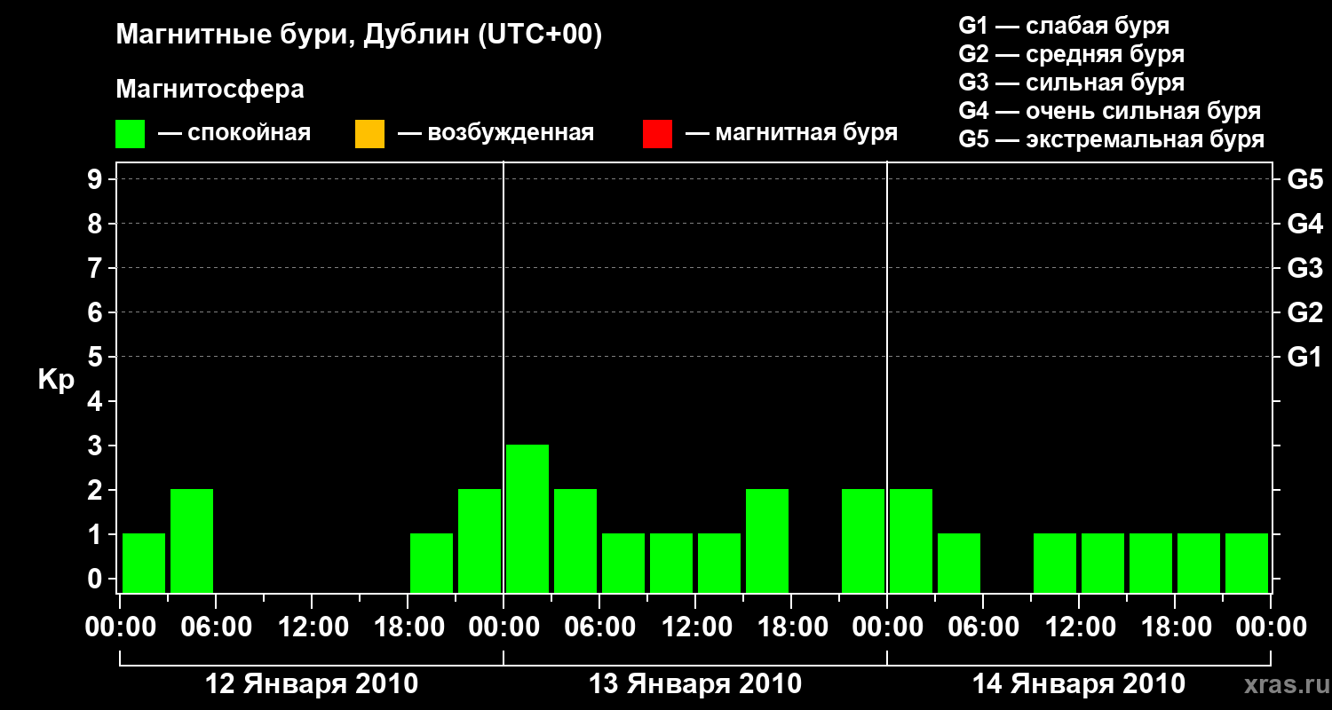 Изменения геомагнитного индекса Kp с 12 по 14 января 2010 года для средних широт