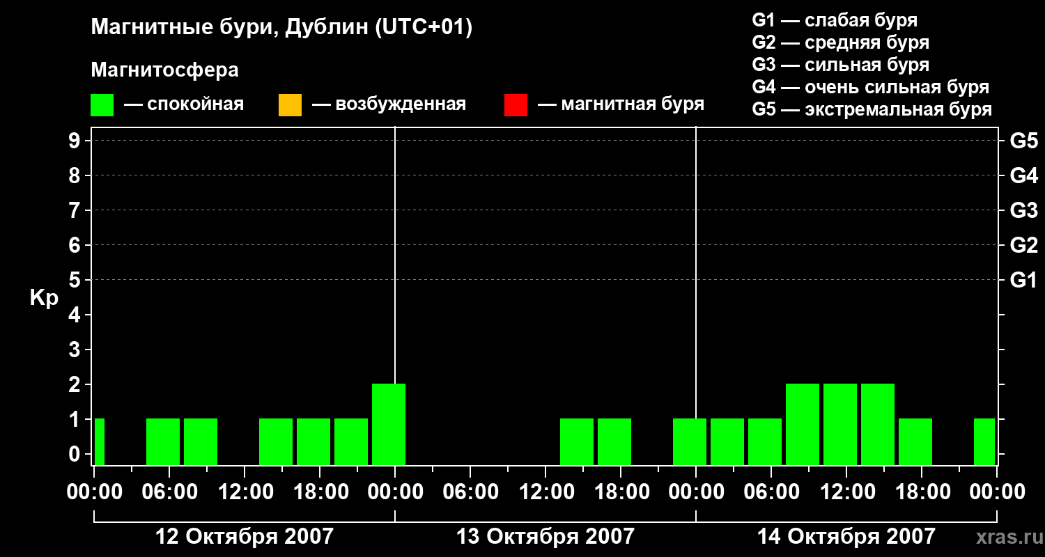 Изменения геомагнитного индекса Kp с 12 по 14 октября 2007 года для средних широт