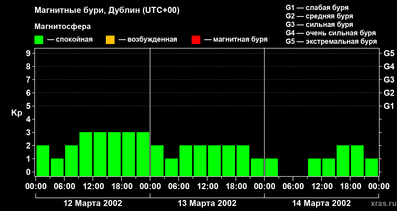 Изменения геомагнитного индекса Kp с 12 по 14 марта 2002 года для средних широт