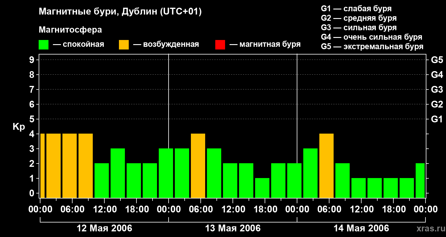 Изменения геомагнитного индекса Kp с 12 по 14 мая 2006 года для средних широт