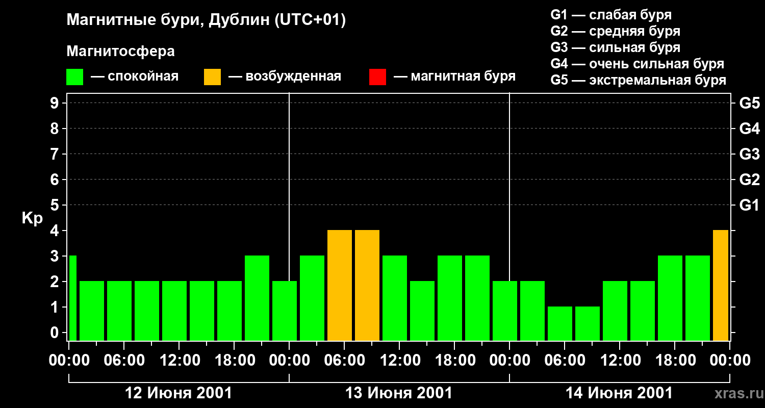 Изменения геомагнитного индекса Kp с 12 по 14 июня 2001 года для средних широт