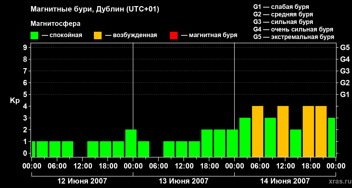 Изменения геомагнитного индекса Kp с 12 по 14 июня 2007 года для средних широт