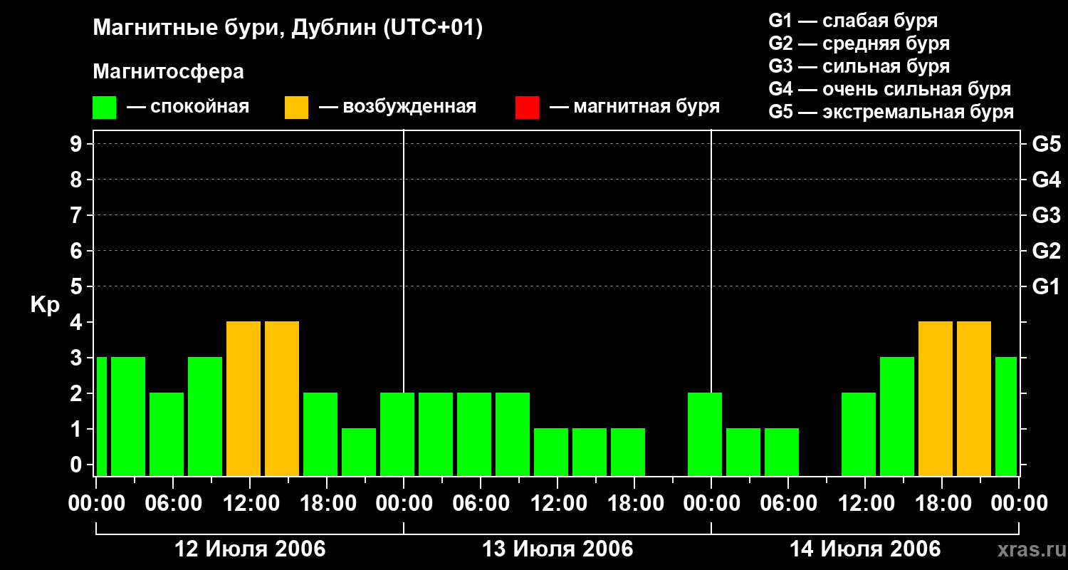 Изменения геомагнитного индекса Kp с 12 по 14 июля 2006 года для средних широт