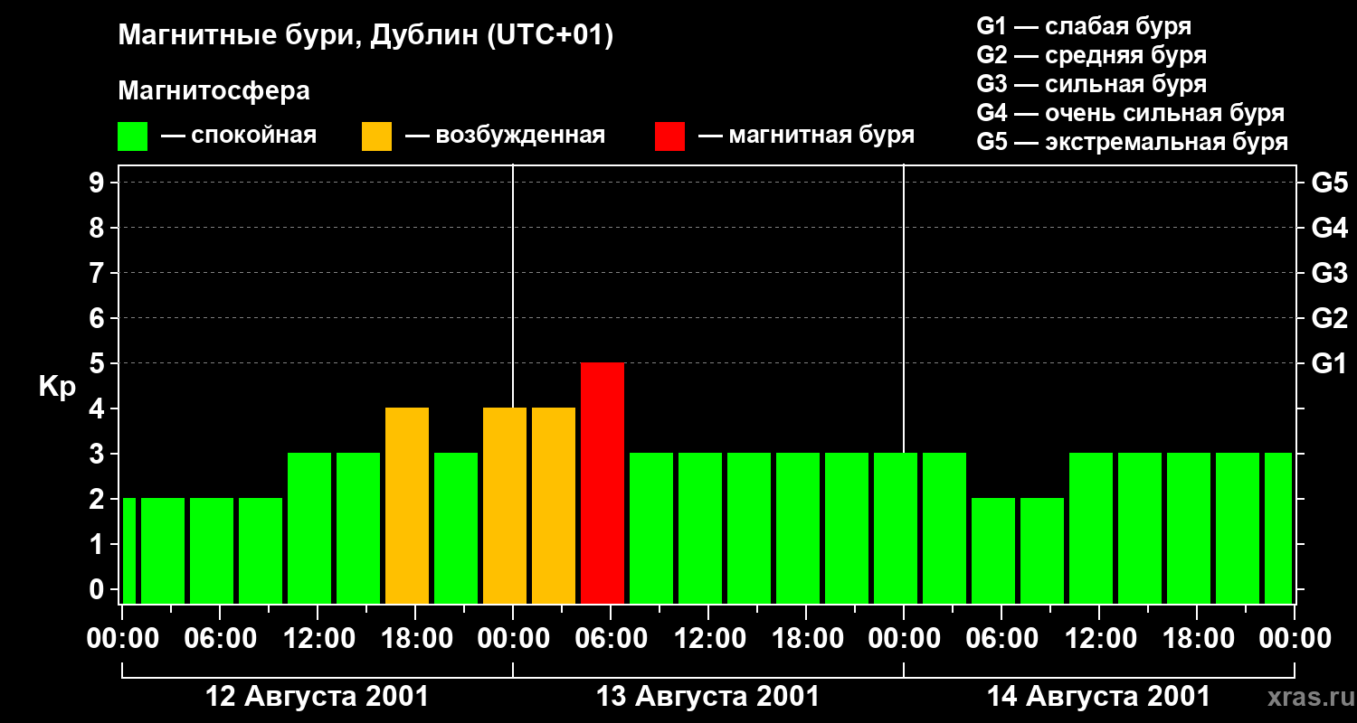 Изменения геомагнитного индекса Kp с 12 по 14 августа 2001 года для средних широт