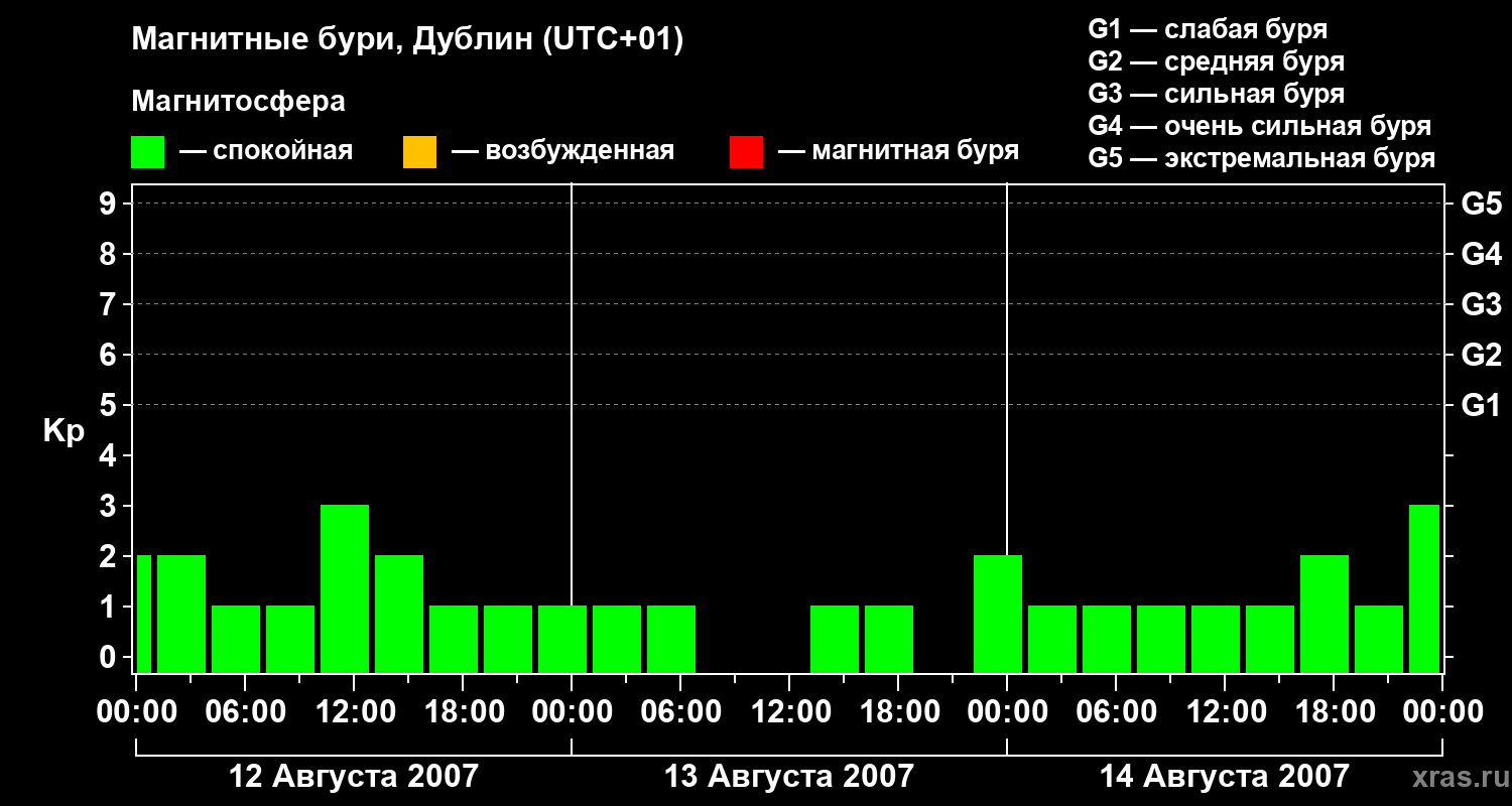Изменения геомагнитного индекса Kp с 12 по 14 августа 2007 года для средних широт