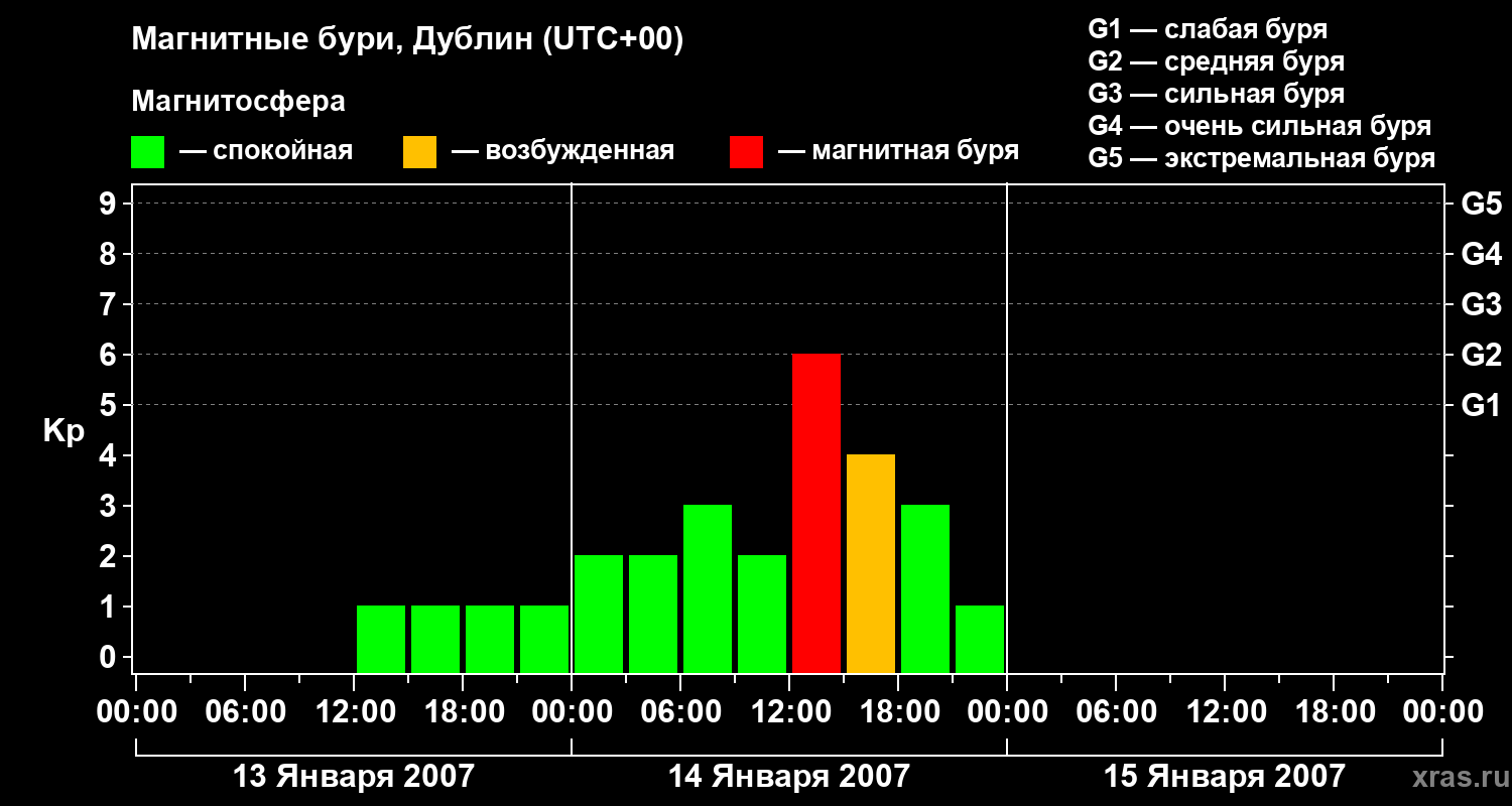 Изменения геомагнитного индекса Kp с 13 по 15 января 2007 года для средних широт