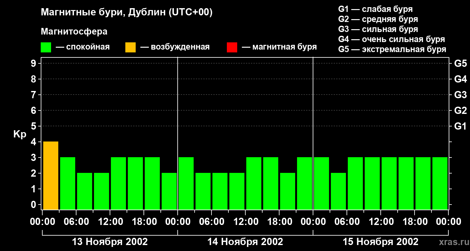 Изменения геомагнитного индекса Kp с 13 по 15 ноября 2002 года для средних широт