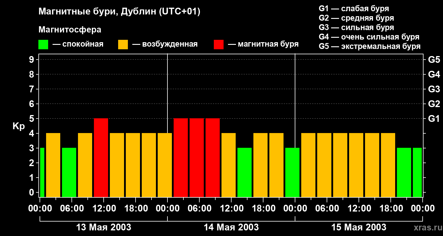 Изменения геомагнитного индекса Kp с 13 по 15 мая 2003 года для средних широт