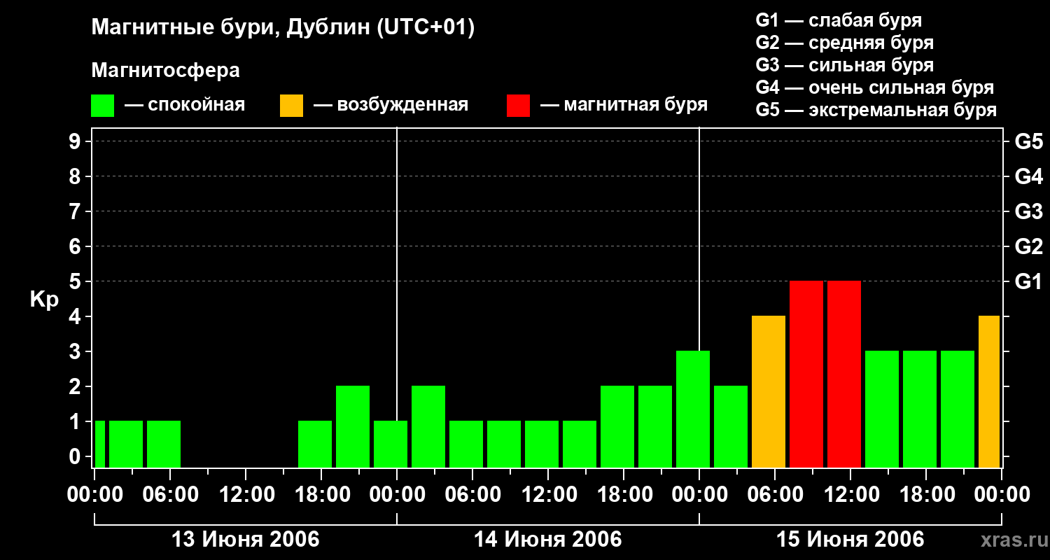Изменения геомагнитного индекса Kp с 13 по 15 июня 2006 года для средних широт