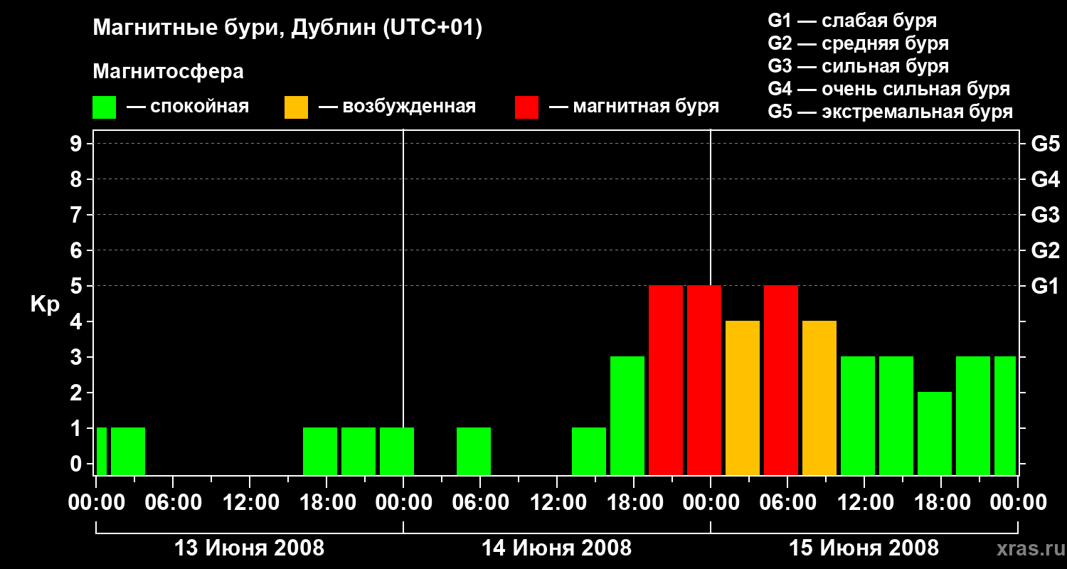 Изменения геомагнитного индекса Kp с 13 по 15 июня 2008 года для средних широт