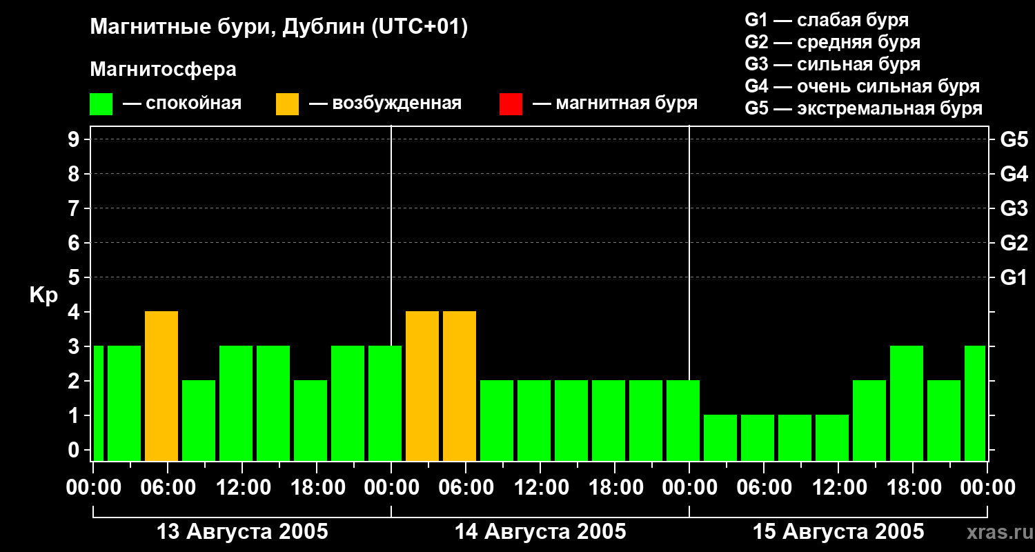 Изменения геомагнитного индекса Kp с 13 по 15 августа 2005 года для средних широт
