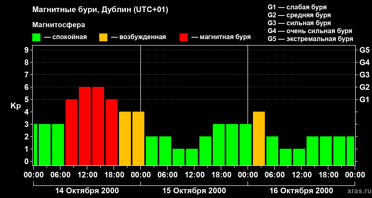 Изменения геомагнитного индекса Kp с 14 по 16 октября 2000 года для средних широт