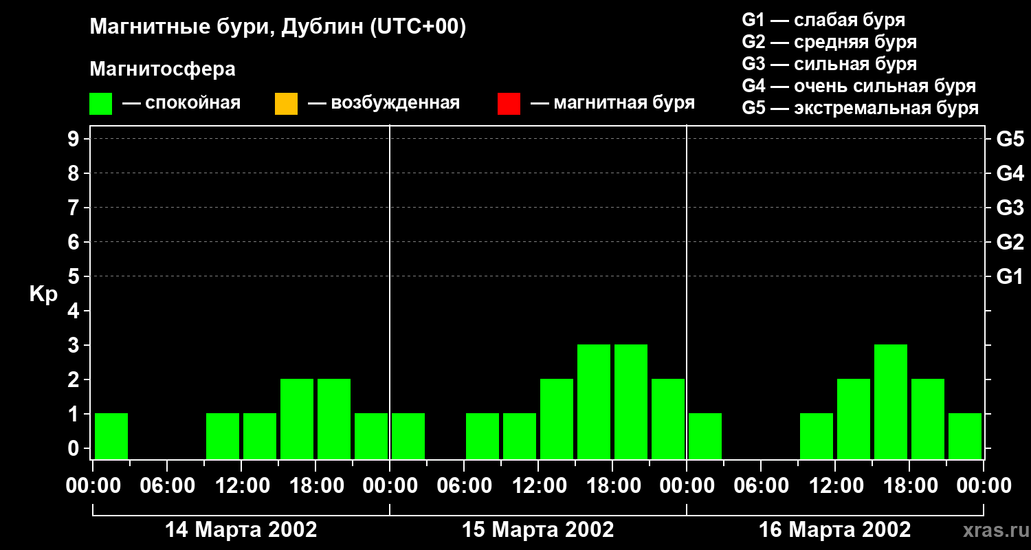 Изменения геомагнитного индекса Kp с 14 по 16 марта 2002 года для средних широт
