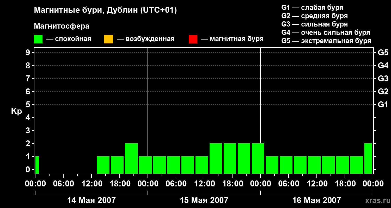 Изменения геомагнитного индекса Kp с 14 по 16 мая 2007 года для средних широт