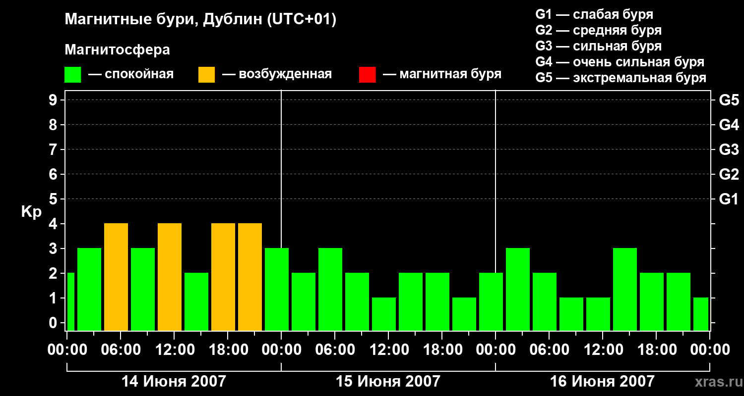 Изменения геомагнитного индекса Kp с 14 по 16 июня 2007 года для средних широт