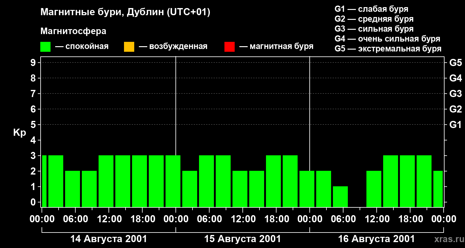 Изменения геомагнитного индекса Kp с 14 по 16 августа 2001 года для средних широт